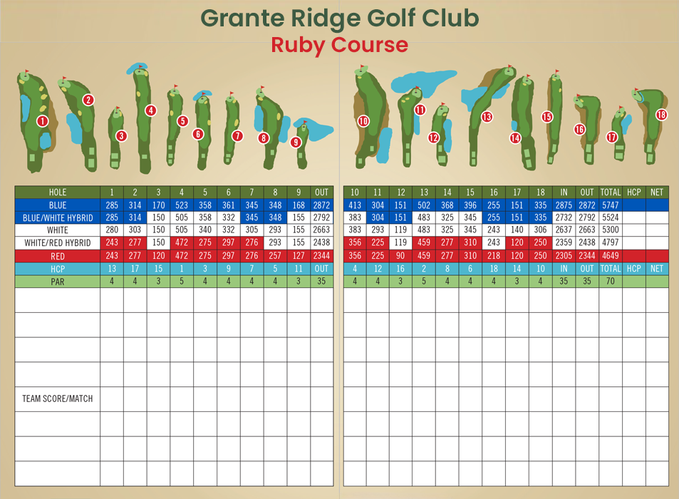 Our Ruby course is a Par 70 layout that can play up to 5900 yards from the Blue Tees. Water comes into play on 14 of the 18 holes. The term risk/reward best describes this course that begins with a short but challenging 1st hole where the player must decide on laying up or attempting to carry the large pond on the left side of the hole. The par 5 4th hole is heavily guarded with trees and fairway bunkers on your 1st and 2nd shots while the pond behind the green will rinse any balls that carry too far on your approach shot.